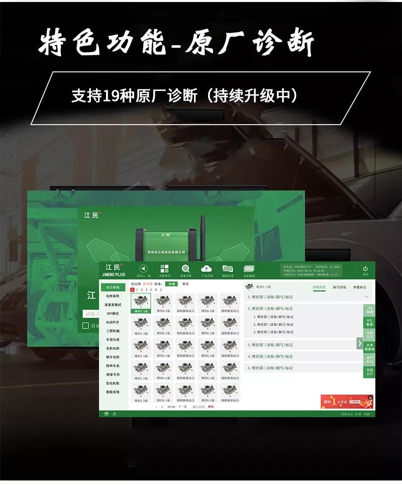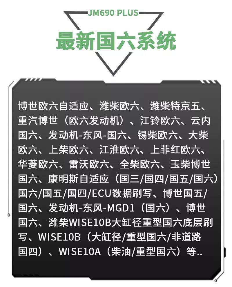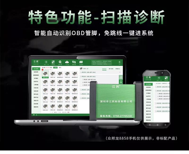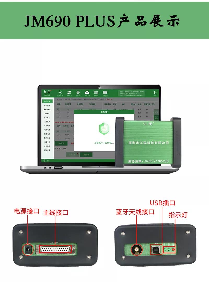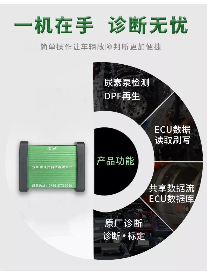 江民690plus綜合版柴油動力診斷儀是專為柴油車維修廠量身定做的一款智能型多功能綜合性診斷設(shè)備,該診斷儀可以檢測市面上包括卡車,客車,皮卡,SUV,工程機械車輛及輪船,發(fā)電機組,農(nóng)業(yè)機械等各類柴油動力,同時兼顧CNG/LNG車輛的故障診斷,可以輕松實現(xiàn)讀取故障碼,清除故障碼,讀數(shù)據(jù)流,元器件測試,標定發(fā)動機參數(shù)及修改ECU數(shù)據(jù)等,并且除檢測發(fā)動機外,還支持ABS/CBCU/AMT 等系統(tǒng)的故障檢測。配備品牌聯(lián)想筆記本電腦,軟件操作更流暢,兼具遠程專家會診功能,隨時隨地聯(lián)上網(wǎng)絡(luò)即可遠程協(xié)助解決各類疑難雜癥故障,一機在手師傅徒弟修車從此無憂,設(shè)備支持手機APP操作,且可以同時安裝五部手機,任何一個工人帶著設(shè)備都可以修車,方便快捷江民690plus全有啦!